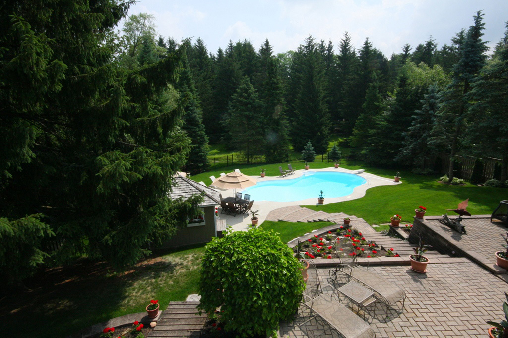 A half acre ‘West Coast’ inspired 5 bedroom home Stream on its border in back yardPrivate back yard with stately established trees borders the propertyLarge semi circular driveway with storm sewer & parking for 5 additional cars 70 + year old gracious pine and spruce trees border the propertyIn ground salt water swimming pool (completed 2008)Cabana with hot and cold running water, sink, toilet and outdoor showerPrivate sewer line running along the north fence adjacent to cabanaStorm sewers on property400 amps power100’ of frontage x 234.25’ (approx) feet of depthBacks onto treed private property