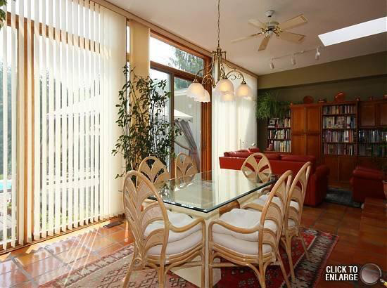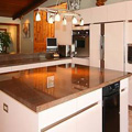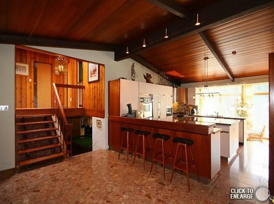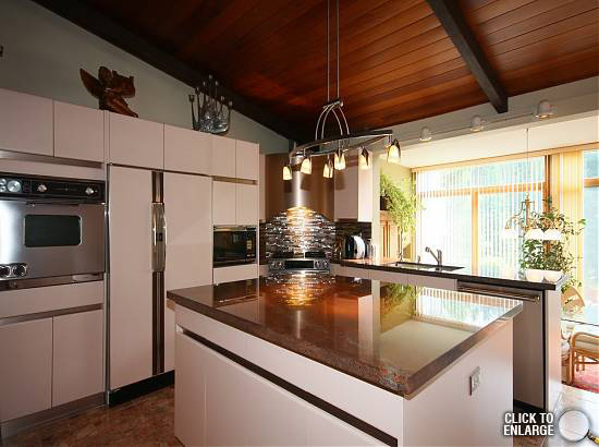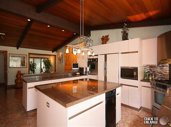 Kitchen has upgraded Granite countertops with dramatic vein formations, marble flooring, cathedral ceiling, panoramic view of the very private back yard,
