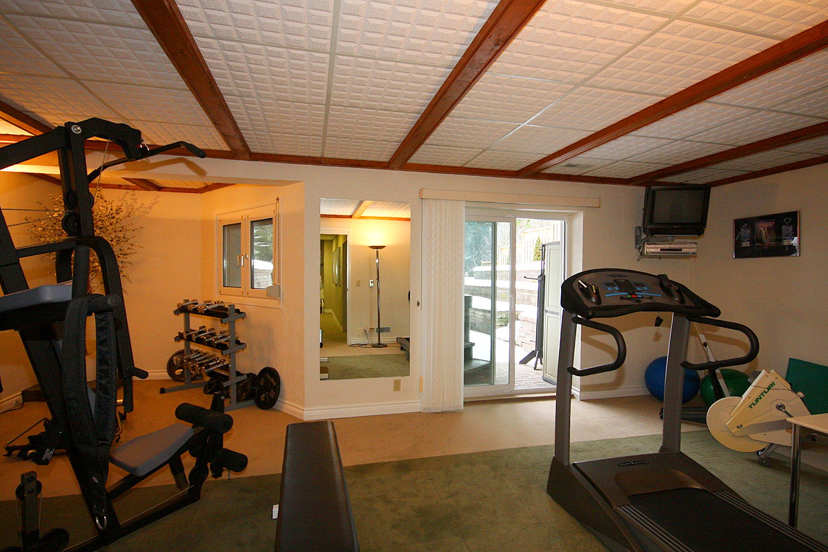 Full, bright fitness room with large window and sliding door with a walk out to hot tub